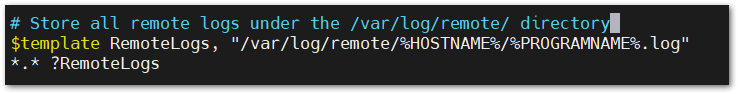 3. At the bottom of the /etc/rsyslog.conf file, add the following lines to store all remote logs in /var/log/remote/, organized by hostname and program name: