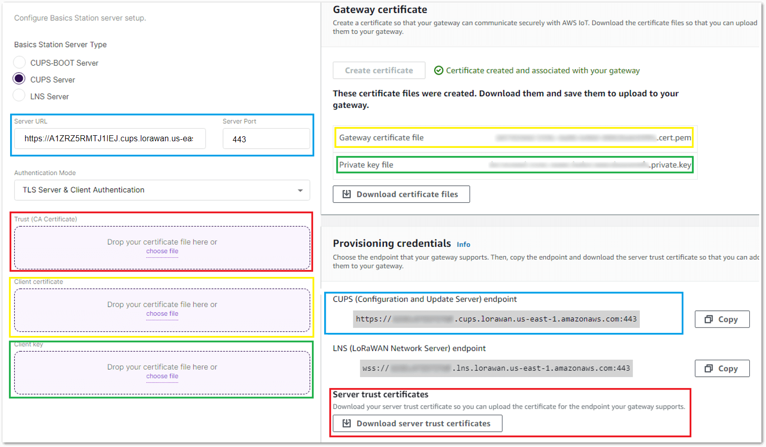 xxxxx.cert.pem) and private key (xxxxxx.private.key).In the section Provisioning credentials, choose Download server trust certificates to download the CUPS (cups.trust) and LNS (lns.trust) server trust certificates.