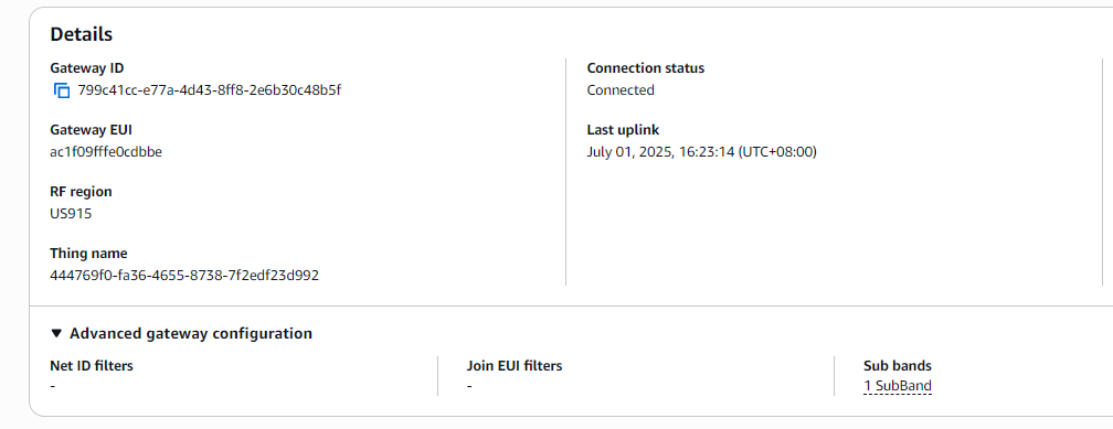 - LNS server:The gateway connects directly to AWS’s LoRaWAN Network Server to send and receive device traffic. Suitable when the gateway is already configured and centrally managed.