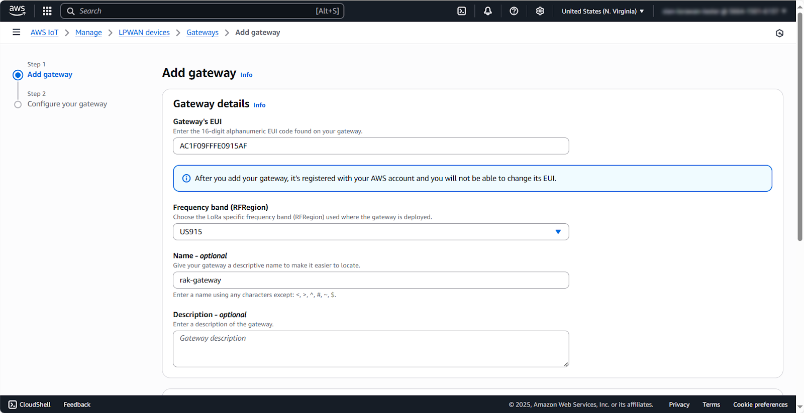 - Ensure the LoRaWAN region matches AWS.