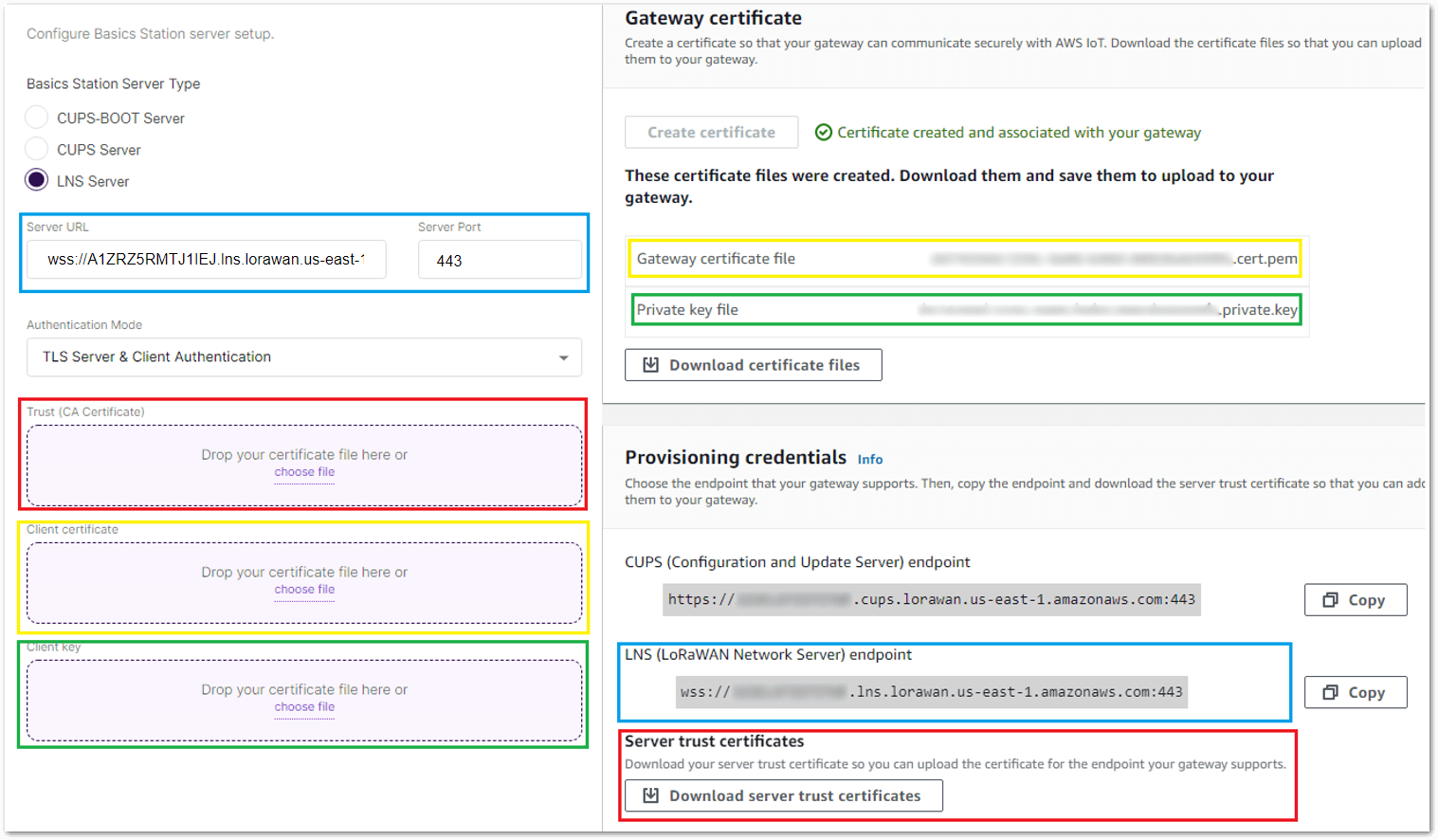 xxxxx.cert.pem) and private key (xxxxxx.private.key).In the section Provisioning credentials, choose Download server trust certificates to download the CUPS (cups.trust) and LNS (lns.trust) server trust certificates.