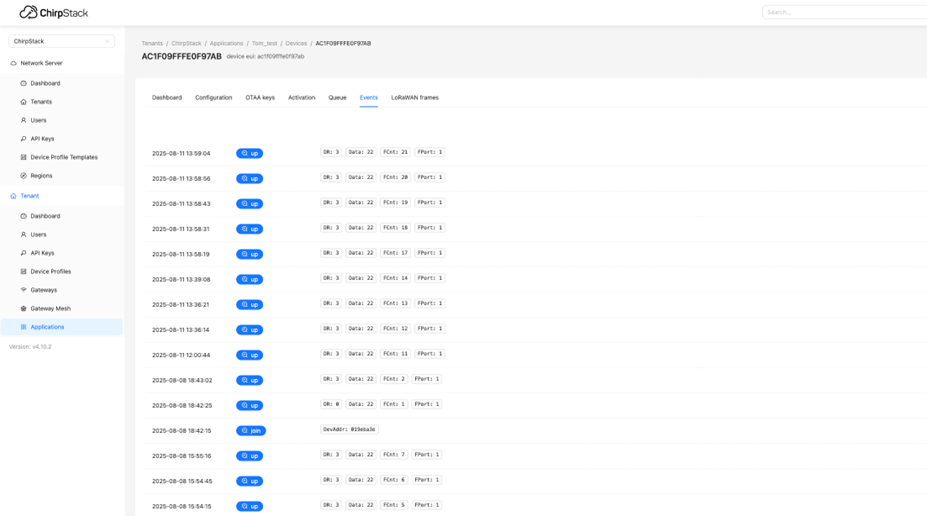 The ChirpStack Events View shows multiple uplinks with consecutive FCnt values appearing almost instantly after reconnection.