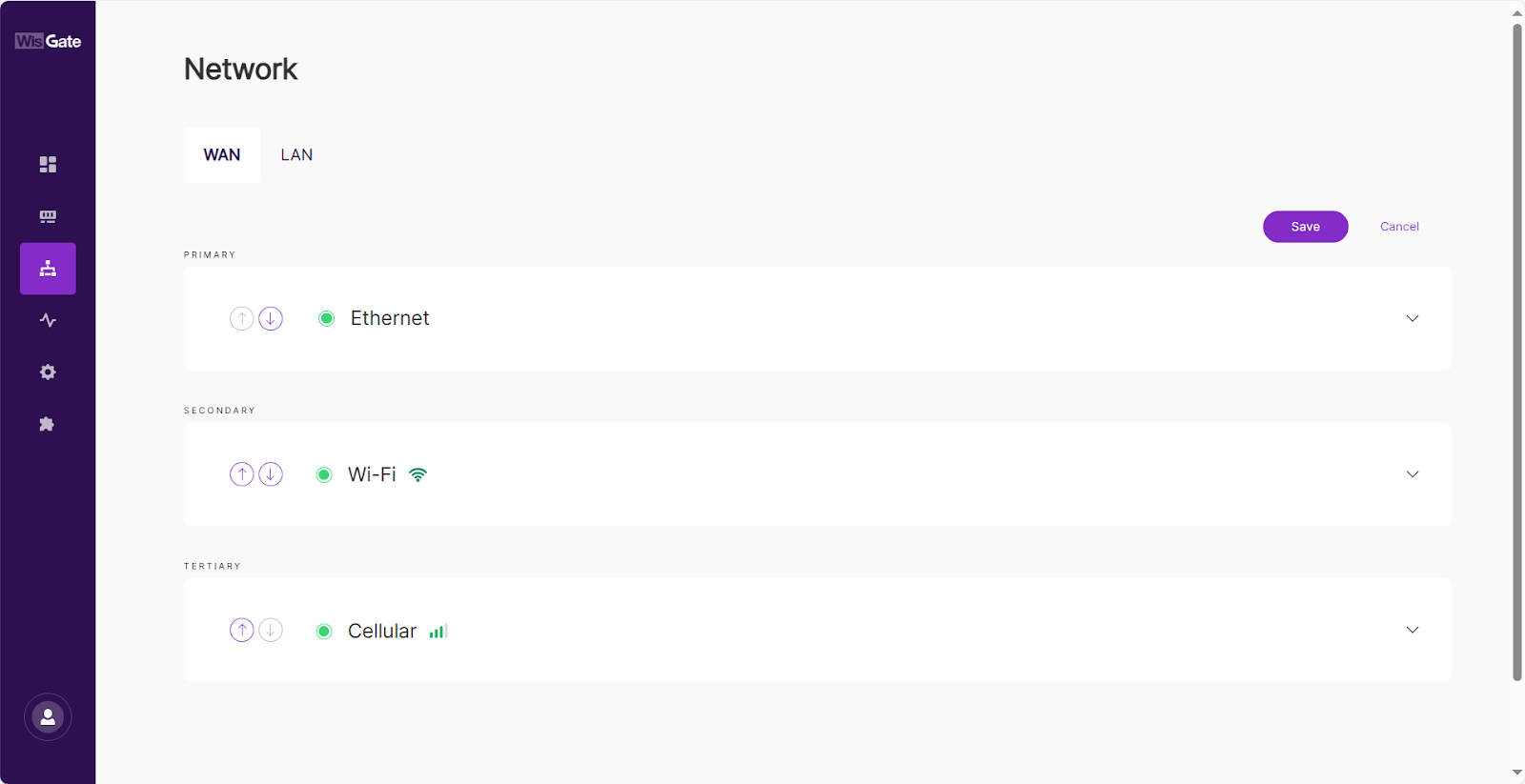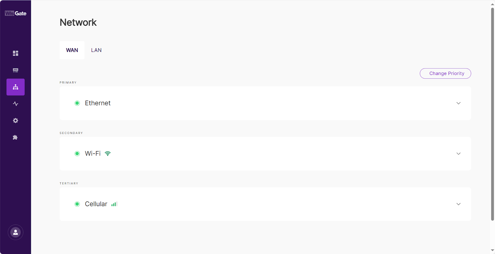Each WAN interface can be assigned a priority level (for example, Ethernet > Wi-Fi > Cellular). The gateway always uses the highest-priority interface that is currently available.