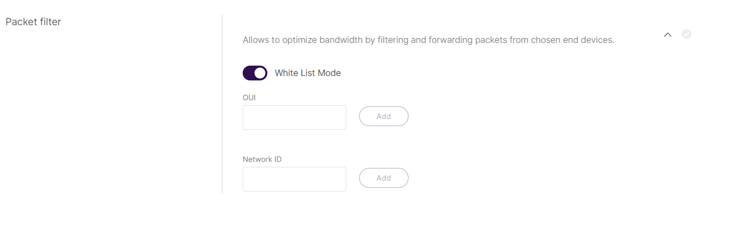Network ID: A value derived from the device’s DevAddr that identifies the LoRaWAN network. Uplink packets are forwarded only if their Network ID matches the configured value.