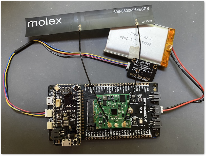 After completing the instructions outlined in the hardware configuration and uploading the code provided by Blues on GitHub to the Notecard, the final assembly should look like the image below: