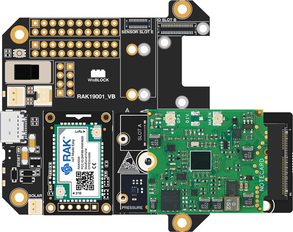 Connect the Blues Notecard via the WisBlock Blues Carrier Module then plug it into the baseboard's IO slot.