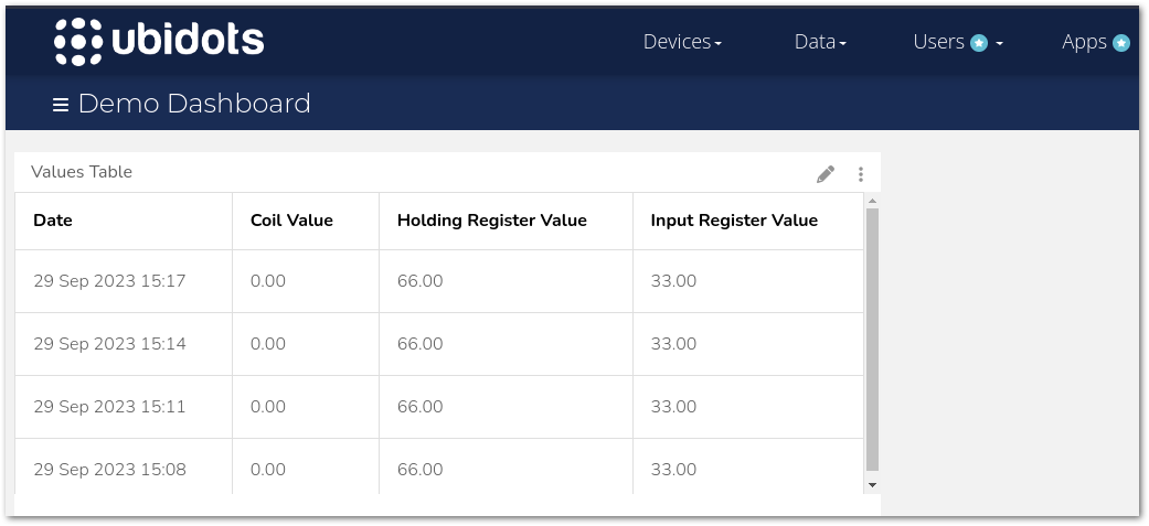 The firmware provides functions to access all registers and inputs. For demonstration, a coil, a holding register, and an input register are read. These values are initialized to 0, 66, and 33. After the data is read, the final result appears in Ubidots, as shown in the figure below.