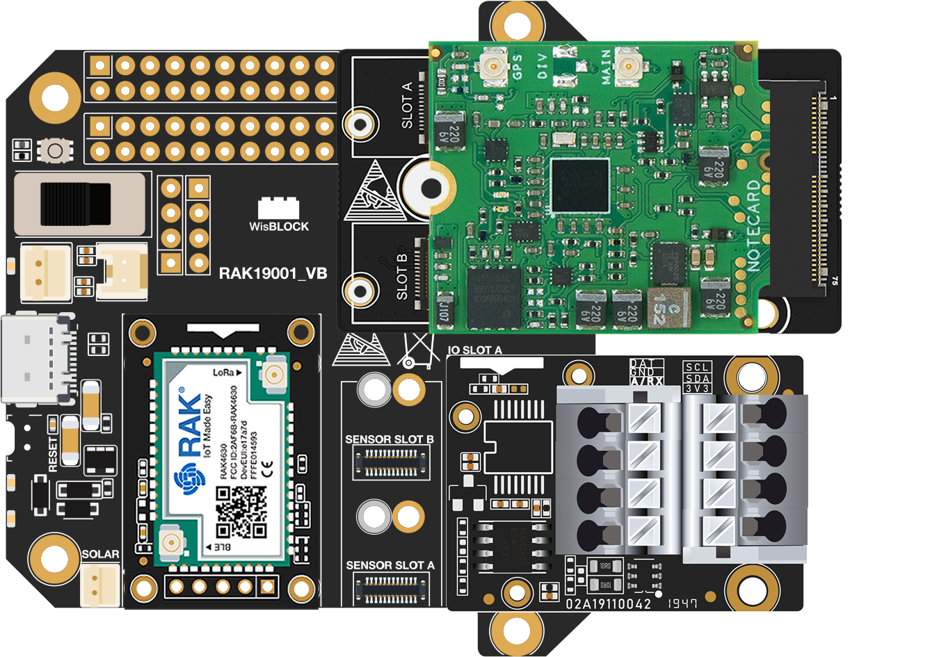 Connect the Blues Notecard via the WisBlock Blues Carrier Module, and insert it into an IO slot on the baseboard.