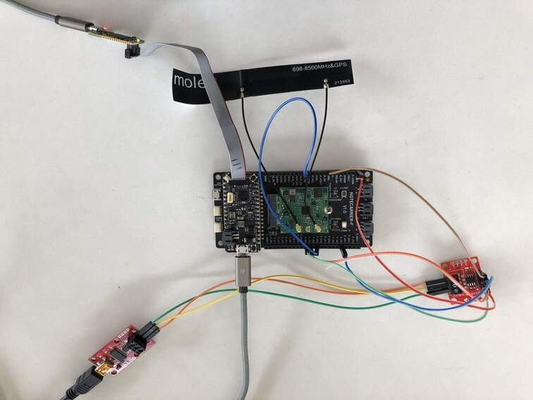 After completing the instructions outlined in the hardware configuration and uploading the code provided by Blues on GitHub to the notecard, the final assembly is shown in the image below: